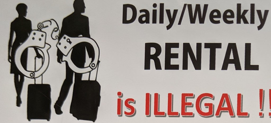 A warning sign welcomed us during recent stay in an Airbnb accommodation. “Daily/Weekly rental is illegal” was the warning plastered at the entrance to the development and on lift lobbies. And it sounded like they really meant it by stating that we would be considered as trespassers and prosecuted.