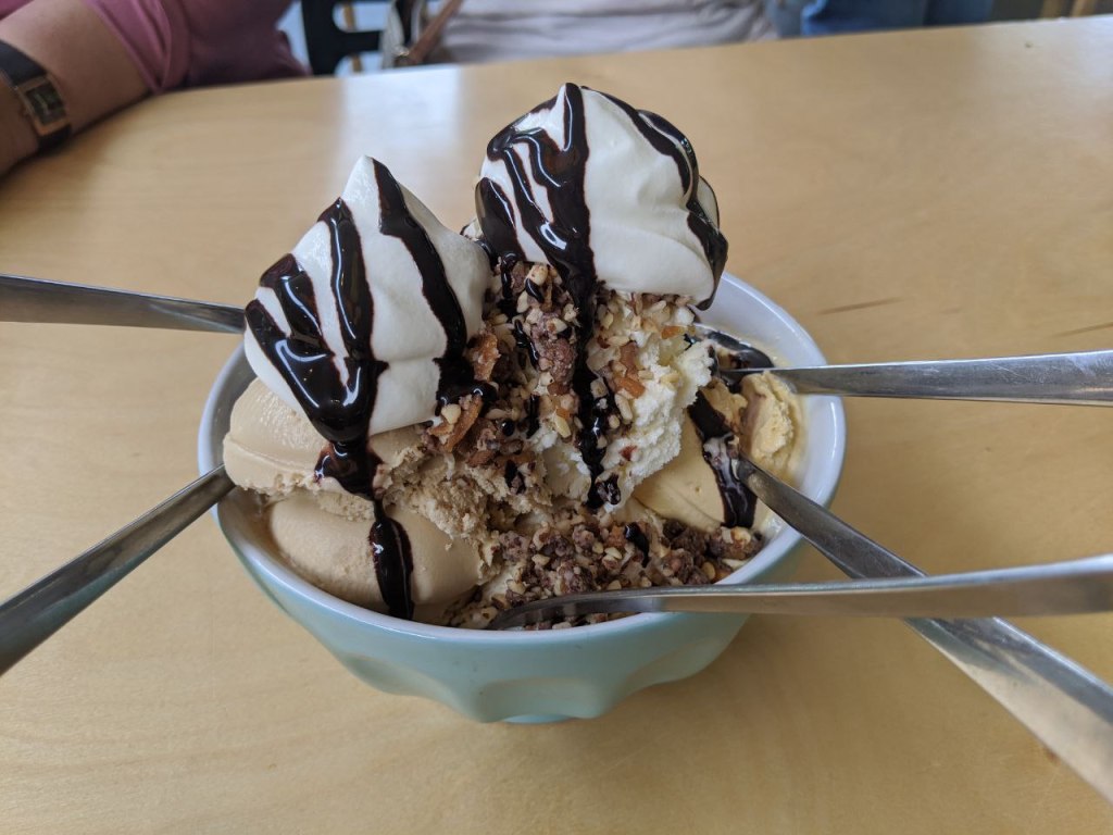 Five scoops of ice cream + Toppings + Chocolate Sauce!