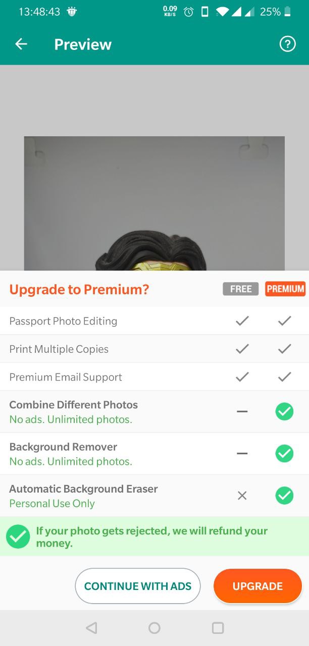 - Once photo is taken, you can proceed to edit it to the actual size. You will be prompted to upgrade to the premium option, but if you’re not too particular, you can just select “continue with ads”