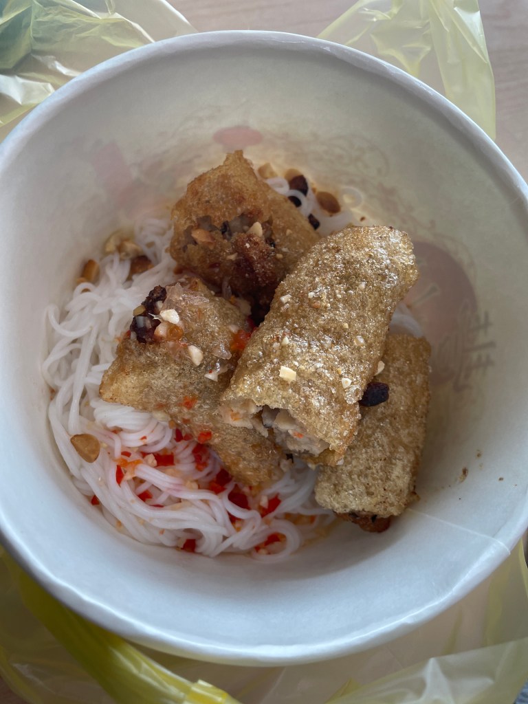 Let’s begin by describing this dish. Unlike Chinese spring rolls which are wrapped in egg or flour-based skin, being wrapped in rice paper skin provides a chewy and crispy texture to the spring rolls. The filling consists of ground pork, shrimps, black fungus, mushroom and other garnish and because of the variety of ingredients, it has many textures in one bite. The dipping sauce consists of fish sauce, chopped nuts, lime/lemon juice, sugar, garlic and fresh chili – this combination complements the fried dish with a tangy and savoury aftertaste.