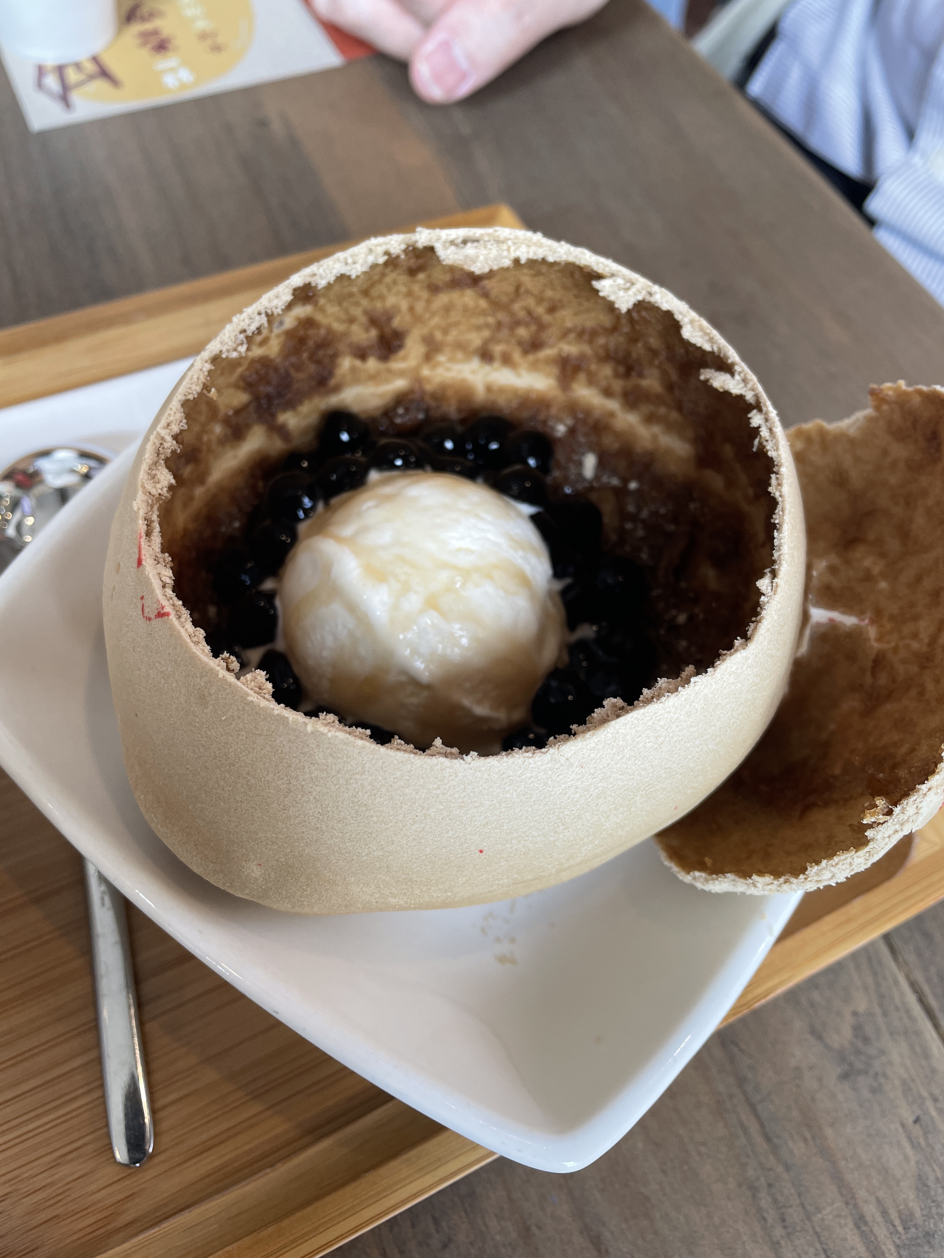 The dessert, 餅冰淇淋 (55 NTD/$2.60), came presented very nicely – a biscuit made of brown sugar, which resembled a coconut husk, had a scoop of ice cream and boba in it. Considering that Taichung is known to where bubble milk tea originated, I loved how they incorporated boba into the dessert.
