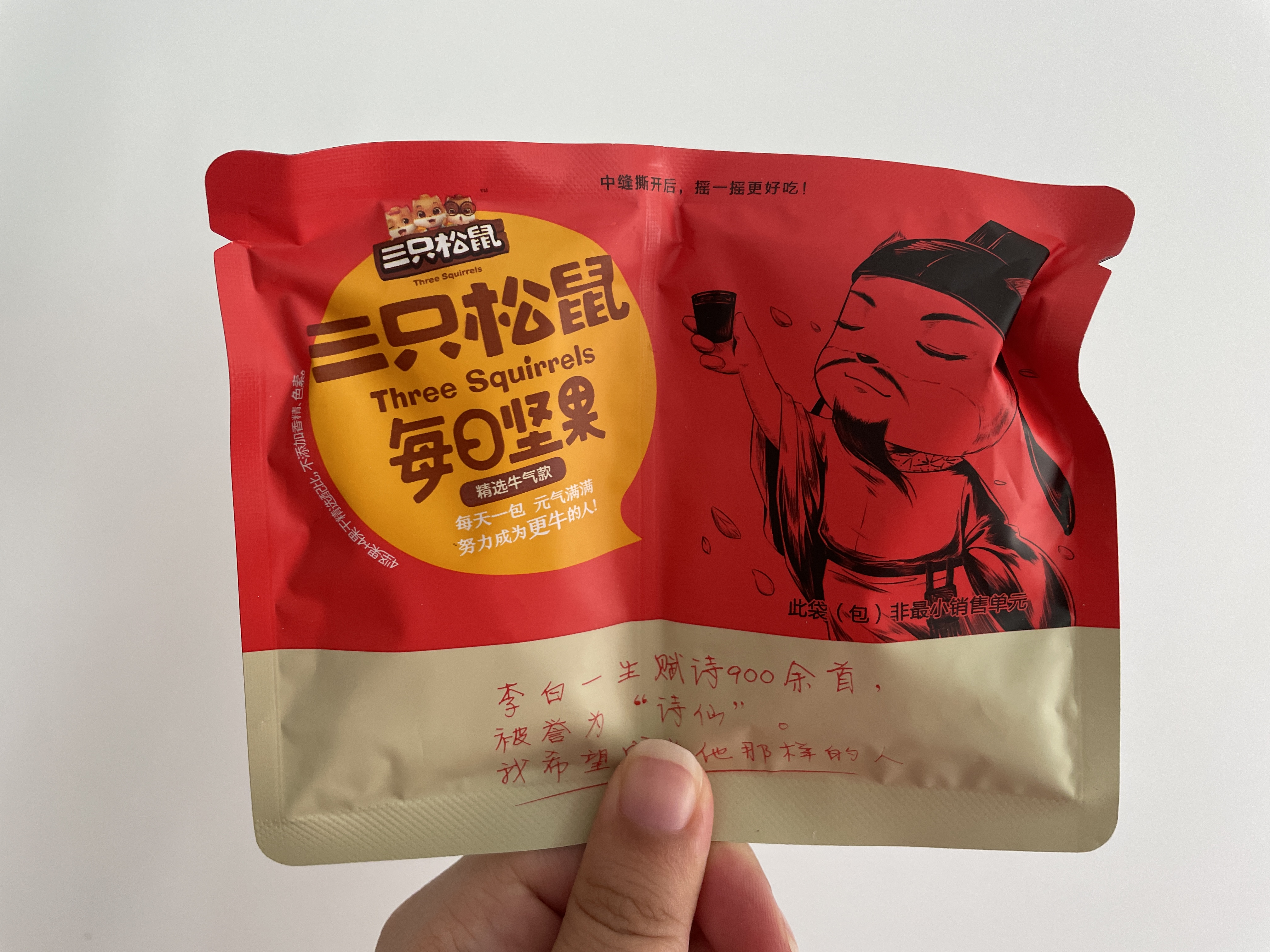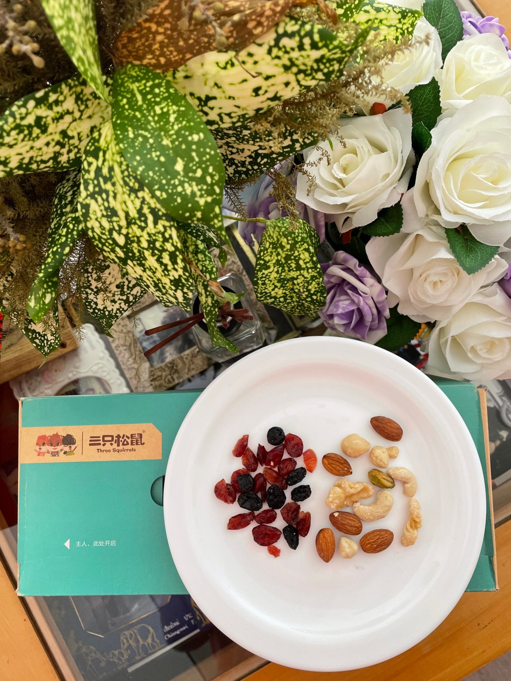 My dad found the Three Squirrels box of nuts (每日坚果) that comes with 30 individual packets. These snacks have been highly appreciated at home, with all of us going back for more each time.