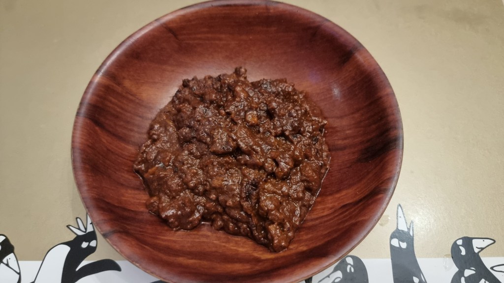 Plant-based minced meat with bean paste: This is probably more authentic in terms of looks and taste. After all, bean paste is bean paste. This is a mite saltish so eating it with rice made it more edible. I won’t recommend having this on its own — complement with rice, bread or noodles.